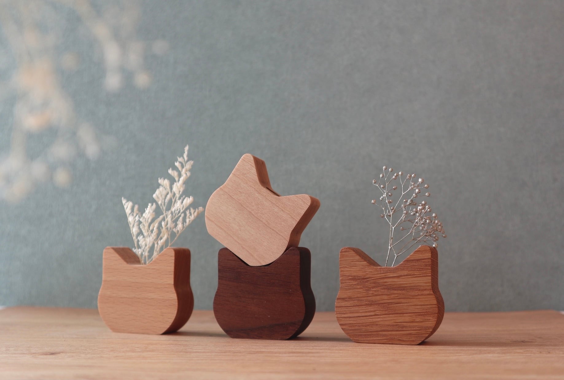手のひらサイズ|木製ネコ花瓶・ひげスタンド