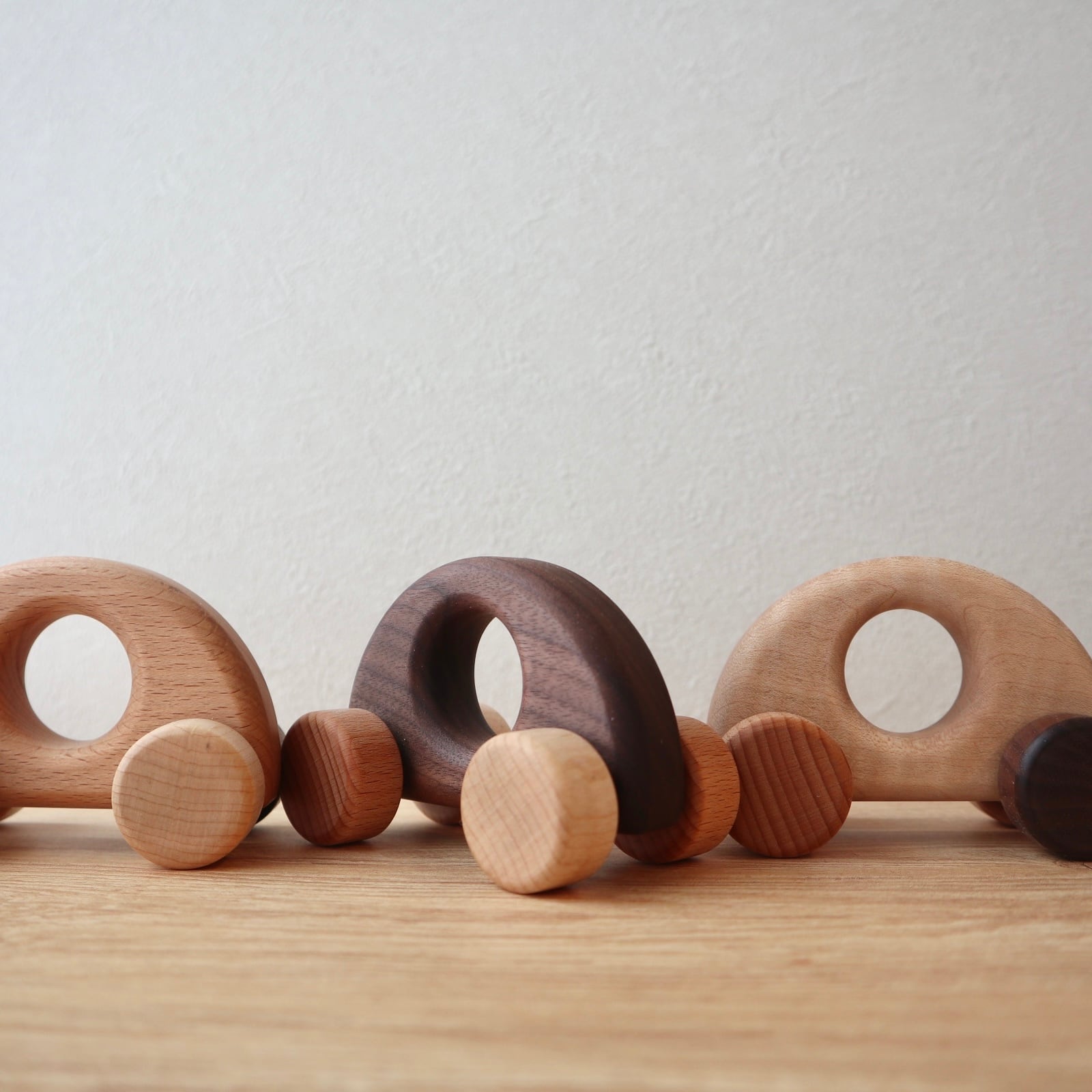 ウォールナットやブナなど銘木を組み合わせデザインされたまんまるくるまは、自然の温もりを感じることができるおもちゃ。